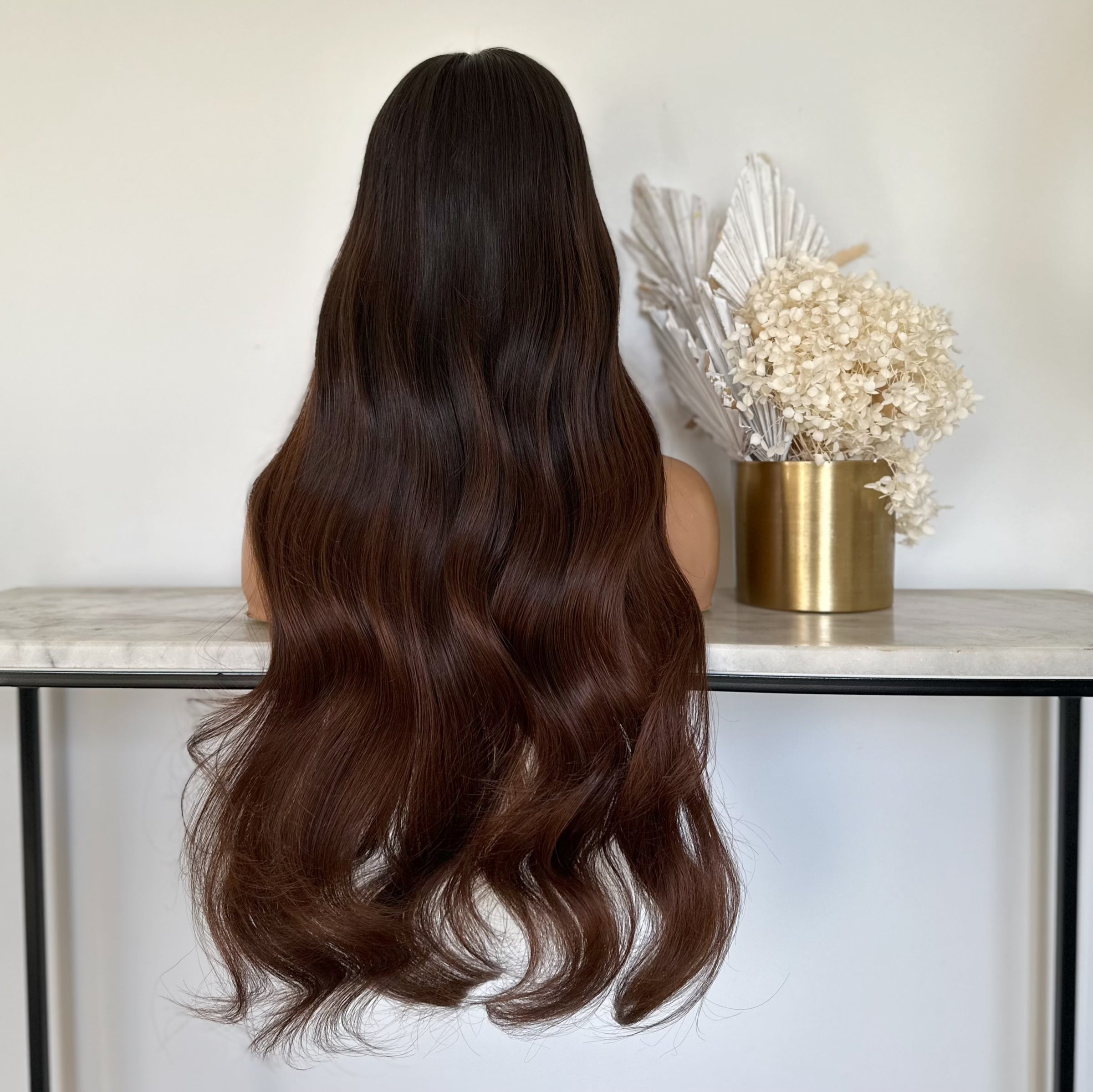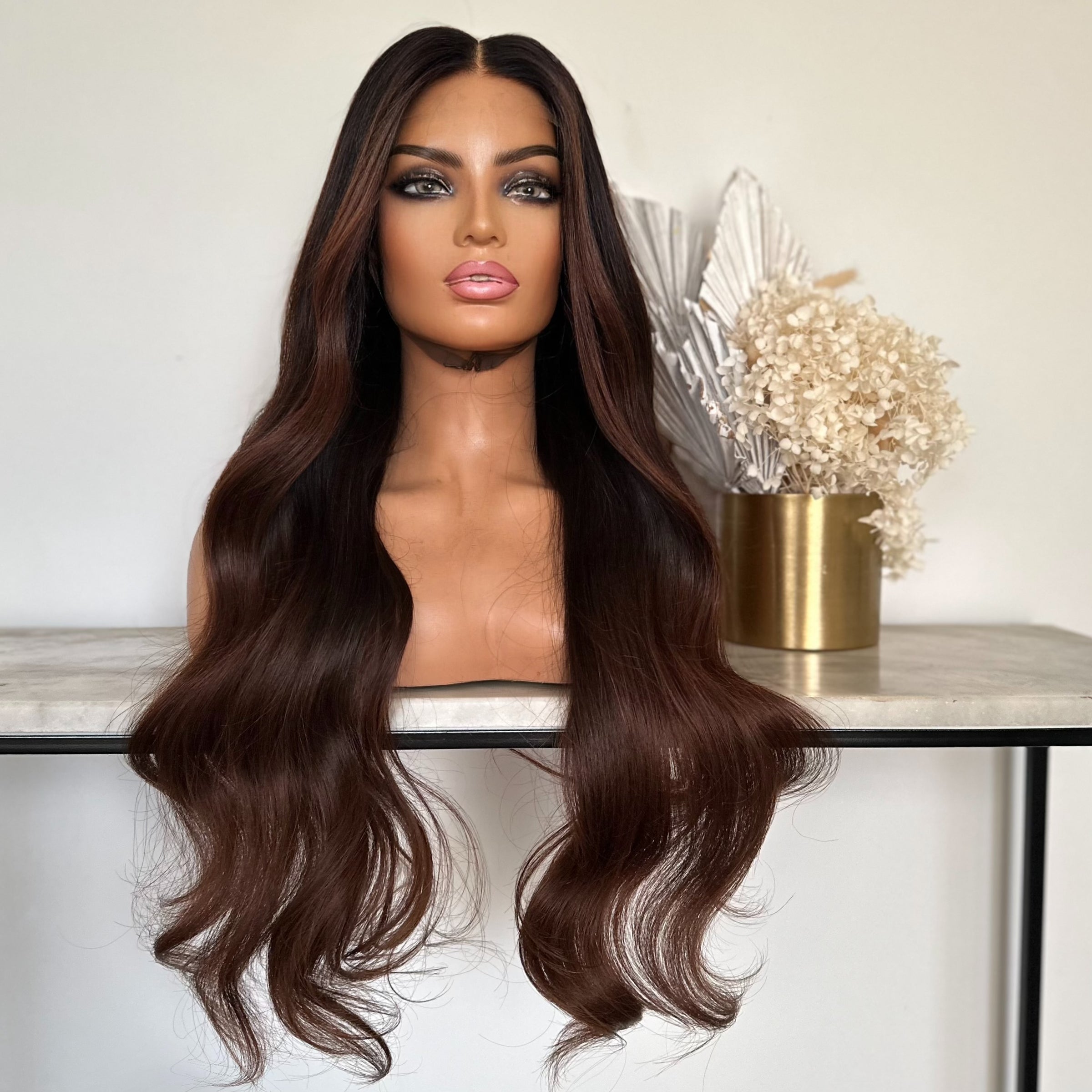 Colour: Darkest brown virgin roots fading into a rich chocolate ombre with face framing chocolate brown highlights